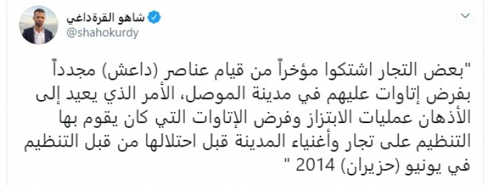 وقال في تغريدة عبر "تويتر" رصدها "المشهد العربي": "بعض التجار اشتكوا مؤخراً من قيام عناصر (داعش) مجدداً بفرض إتاوات عليهم في مدينة الموصل، الأمر الذي يعيد إلى الأذهان عمليات الابتزاز وفرض الإتاوات التي كان يقوم بها التنظيم على تجار وأغنياء المدينة قبل احتلالها من قبل التنظيم في يونيو (حزيران) 2014 ".