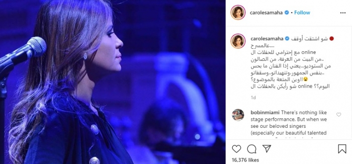 وكتبت عبر حسابها الشخصي على موقع "انستجرام": "شو اشتقت أوقف عالمسرح.. مع إحترامي للحفلات ال online من البيت من الغرفة، من الصالون.. من الستوديو.. يعني إذا الفنان ما بحس بنفس الجمهور، وتنهيداتو.. وسقفاتو.. وين المتعة بالموضوع"، ووجهت سؤال لمتابعيها "شو رأيكن بالحفلات ال online اليوم؟؟".