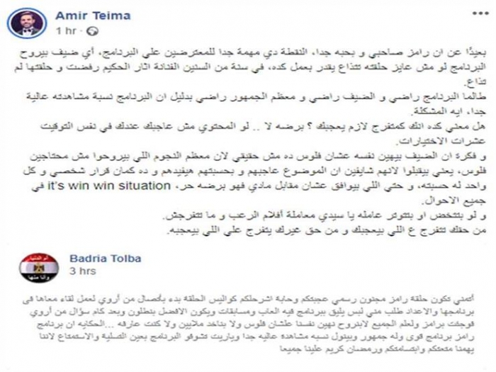 وكتب طعيمة: "بعيدًا عن إن رامز صاحبي وبحبه جدا، النقطة دي مهمة جدا للمعترضين على البرنامج، أي ضيف بيروح البرنامج لو مش عايز حلقته تتذاع يقدر يعمل كده".
