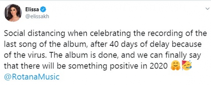ونشرت إليسا صورة بصحبة أصدقائها، وعلقت: "التباعد الاجتماعي عند الاحتفال بتسجيل آخر أغنية للألبوم ، بعد 40 يومًا من التأخير بسبب الفيروس، تم الانتهاء من الألبوم، ويمكننا القول أخيرًا أنه سيكون هناك شيء إيجابي في عام 2020".