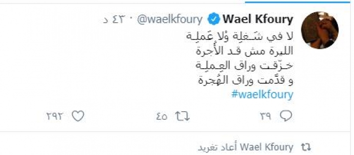 وعلق "كفوري" عبر حسابه الرسمي بموقع تويتر، بأبيات شعر قائلا: "لا في شَـغلِة وْلا عَملِـة، الليرة مش قـد الأُجرة خـزّقـت وراق العِـملِـة و قدَّمت وراق الهُجرة".