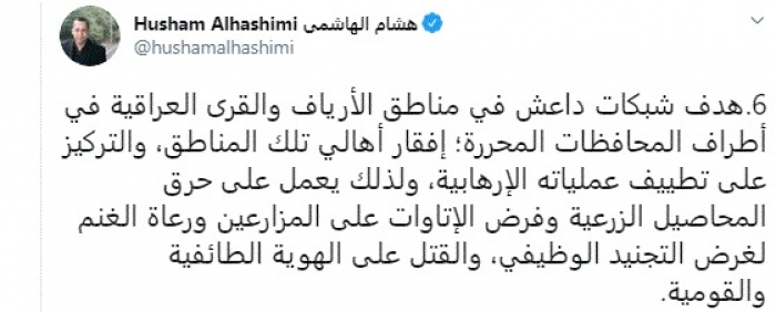 كشف الباحث السياسي العراقي هشام الهاشمي، اليوم، سر تركيز تنظيم داعش على تنشيط عملياته الإرهابية في القرى العراقية.
