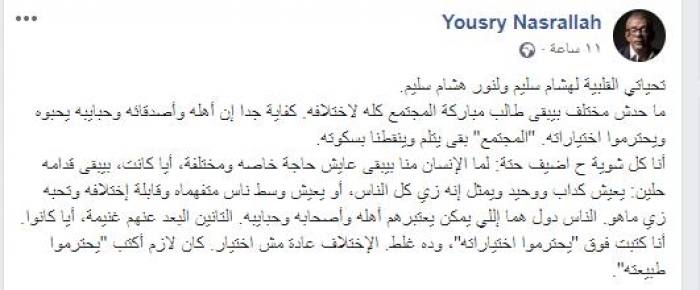 وعلق المخرج الكبير يسري نصرالله، عبر حسابه الرسمي بموقع فيسبوك: "تحياتي القلبية لهشام سليم ولنور هشام سليم، ماحدش مختلف بيبقى طالب مباركة المجتمع كله لاختلافه، كفاية جدا إن أهله وأصدقائه وحبايبه يحبوه ويحترموا اختياراته، (المجتمع) بقى يتلم وينقطنا بسكوته".