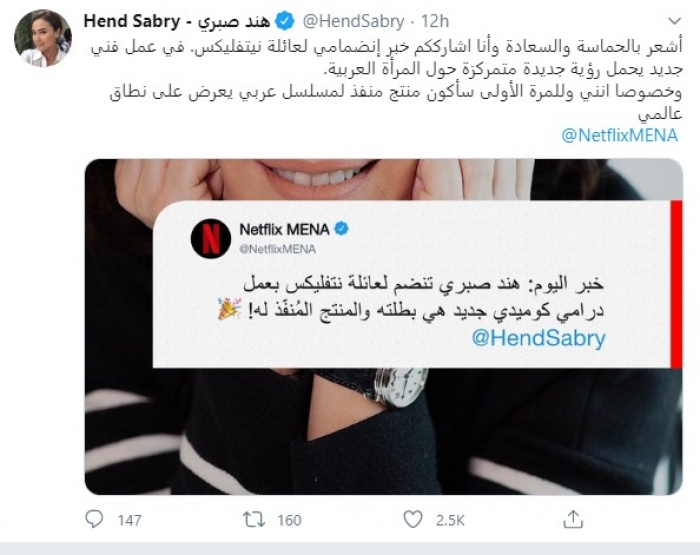 وكتبت هند عبر حسابها على موقع "تويتر": "أشعر بالحماسة والسعادة وأنا أشارككم خبر انضمامي لعائلة نتفليكس. في عمل فني جديد يحمل رؤية جديدة متمركزة حول المرأة العربية".