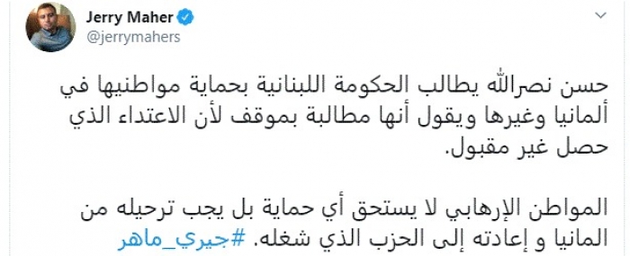 علق الكاتب الصحفي اللبناني جيري ماهر، اليوم، على مطالبة الأمين العام لحزب الله حسن نصرالله بحماية عناصر الحزب في ألمانيا.
