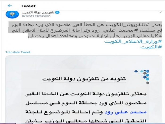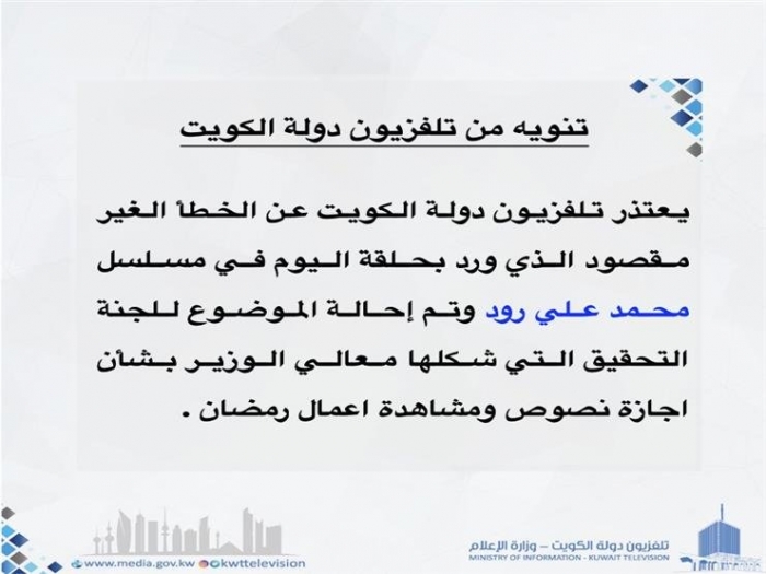 وأصدر تليفزيون الكويت، عبر صفحته الرسمية بموقع "تويتر" بيانًا رسميًا يعتذر فيه عن الخطأ الغير مقصود، الذي ورد بإحدى حلقات مسلسل محمد علي رود، وجاء في البيان "تم إحالة الموضوع للجنة التحقيق التي شكلها معالي الوزير بشأن إجازة نصوص ومشاهدة أعمال رمضان".