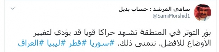 وكتب عبر تغريدة له على "تويتر" رصدها " المشهد العربي":"بؤر التوتر في المنطقة تشهد حراكا قويا قد يؤدي لتغيير الأوضاع للأفضل نتمنى ذلك سوريا قطر ليبيا العراق".