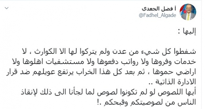وكتب الجعدي عبر تغريدة له على "تويتر" رصدها " المشهد العربي":"شفطوا كل شيء من عدن ولم يتركوا لها إلا الكوارث ، لا خدمات وفروها ولا رواتب دفعوها ولا مستشفيات أهلوها ولا أراضي حموها ، ثم بعد كل هذا الخراب يرتفع عويلهم ضد قرار الإدارة الذاتية".