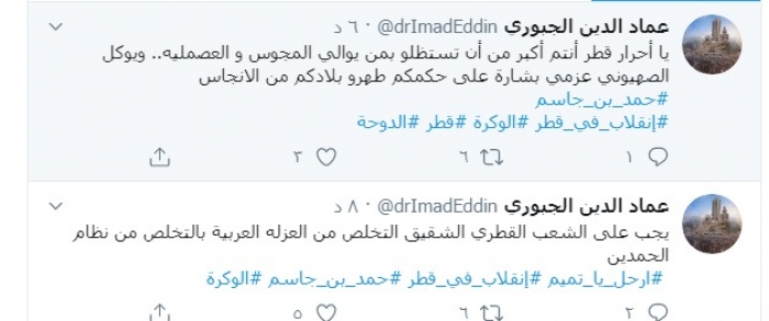 وأضاف:"يا أحرار قطر أنتم أكبر من أن تستظلوا بمن يوالي المجوس و العصملية ويوكل الصهيوني عزمي بشارة على حكمكم طهروا بلادكم من...".