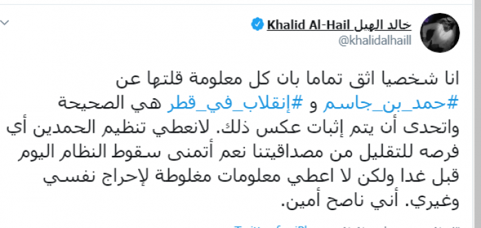 واختتم :"أنا شخصيا أثق تماما بأن كل معلومة قلتها عن حمد بن جاسم و انقلاب قطر هي الصحيحة واتحدي أن يتم إثبات عكس ذلك، لا نعطي تنظيم الحمدين أي فرصه للتقليل من مصداقيتنا نعم أتمنى سقوط النظام اليوم قبل غدا ولكن لا أعطي معلومات مغلوطة لإحراج نفسي وغيري، أني ناصح أمين".