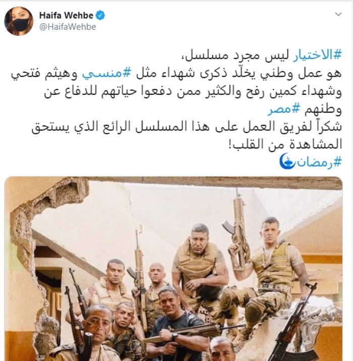 وكتبت هيفاء، عبر حسابها على تويتر، قائلة: "الاختيار ليس مجرد مسلسل.. هو عمل وطني يخلّد ذكرى شهداء مثل منسي وهيثم وفتحي، وشهداء كمين رفح والكثير ممن دفعوا حياتهم للدفاع عن وطنهم مصر".
