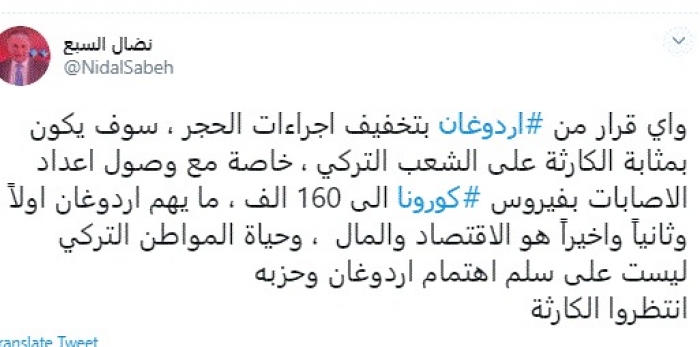توقع المحلل السياسي اللبناني نضال السبع، اليوم، حدوث كارثة في تركيا بسبب فيروس كورونا، وذلك جراء نية الرئيس التركي رجب طيب أردوغان بتخفيف إجراءات مواجهة الوباء.