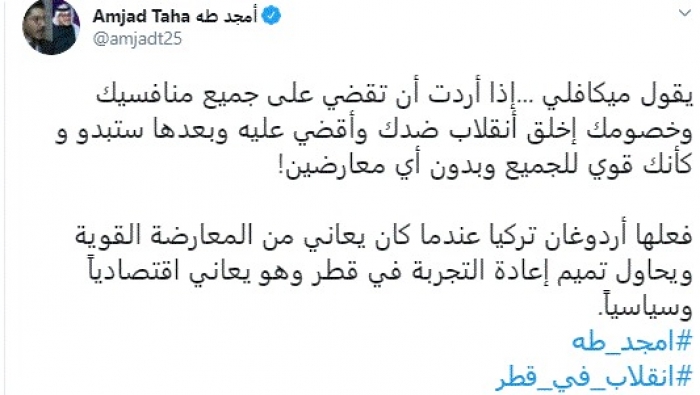 وقال في تغريدة عبر "تويتر" رصدها "المشهد العربي": "يقول ميكافلي...إذا أردت أن تقضي على جميع منافسيك وخصومك إخلق أنقلاب ضدك وأقضي عليه وبعدها ستبدو و كأنك قوي للجميع وبدون أي معارضين".