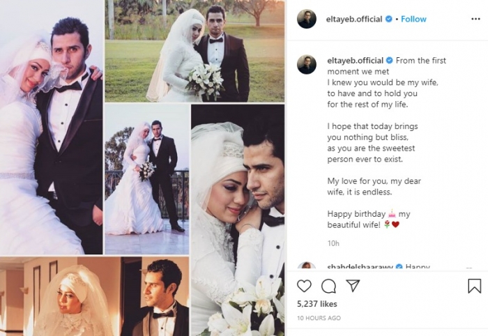 ونشر الطيب صورة من حفل زفافه، عبر حسابه الرسمي بموقع "إنستجرام"، وعلق: " 5/5 عيد ميلاد حبييتي وزوجتي وصاحبتي وأم بناتي.. والسند، كل سنة وانتي حبيبتي الغالية كل سنة وأنتي نعمة ربنا يديمها عليه و يباركلي فيكي ويحفظك ويخليكي لينا يا ست البنات".