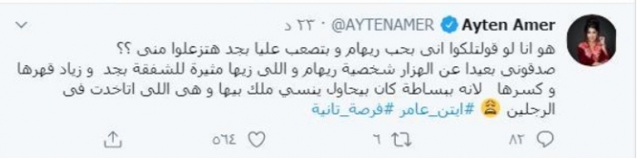 نشرت الفنانة أيتن عامر عبر حسابها الشخصي بموقع "تويتر"، تغريدة تعلق بها على شخصية ريهام التي تؤديها في مسلسل "فرصة تانية".