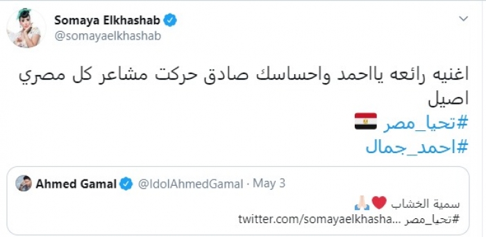 وكتبت الخشاب تغريدة، عبر حسابها الرسمي بموقع "تويتر" :"أغنية رائعة يا أحمد وإحساسك صادق، حركت مشاعر كل مصري أصيل".