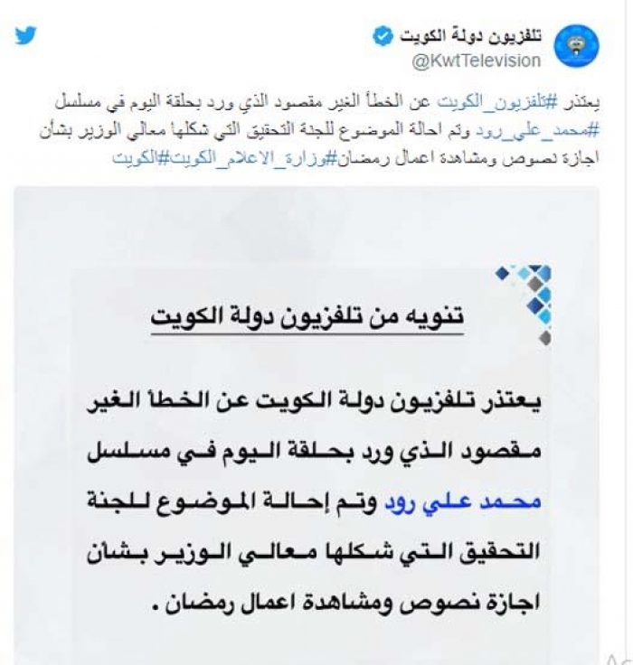 وكان التليفزيون الكويتي، قد قدم اعتذارا عن الخطأ غير المقصود الذي ورد بحلقة الأحد في مسلسل "محمد علي ورد"، كما أكدت الصفحة الرسمية للتليفزيون الكويتي وقتها أنه تم إحالة الأمر إلى لجنة تحقيق شكلها وزير الإعلام بشأن إجازة النصوص في رمضان.