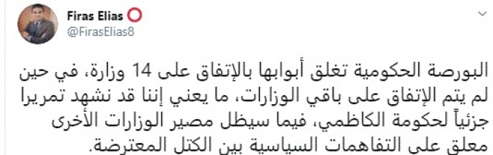 وقال في تغريدة عبر "تويتر" رصدها "المشهد العربي": "البورصة الحكومية تغلق أبوابها بالإتفاق على 14 وزارة، في حين لم يتم الإتفاق على باقي الوزارات".