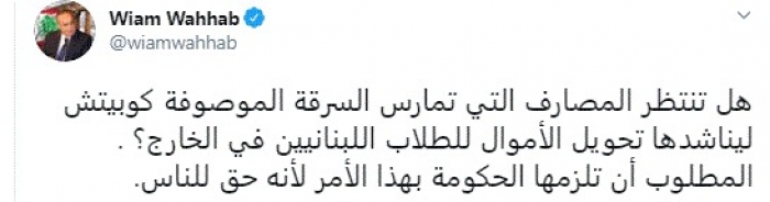 وقال في تغريدة عبر "تويتر" رصدها "المشهد العربي": "هل تنتظر المصارف التي تمارس السرقة الموصوفة كوبيتش ليناشدها تحويل الأموال للطلاب اللبنانيين في الخارج؟ . المطلوب أن تلزمها الحكومة بهذا الأمر لأنه حق للناس".