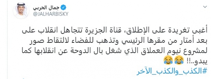 وقال في تغريدة عبر "تويتر" رصدها "المشهد العربي": "أغبى تغريدة على الإطلاق، قناة الجزيرة تتجاهل انقلاب على بعد أمتار من مقرها الرئيسي وتذهب للفضاء لالتقاط صور لمشروع نيوم العملاق الذي شغل بال الدوحة عن انقلابها كما يبدو".