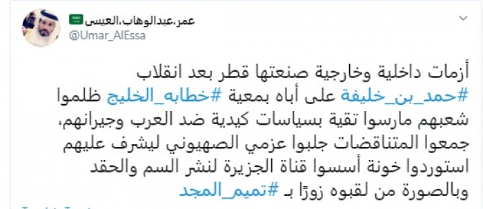 وكتب في تغريدة عبر "تويتر" رصدها "المشهد العربي": "أزمات داخلية وخارجية صنعتها قطر بعد انقلاب حمد بن خليفة على أباه بمعية خطابة الخليج ظلموا شعبهم مارسوا تقية بسياسات كيدية ضد العرب وجيرانهم".
