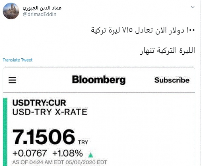 وقال في تغريدة عبر "تويتر" رصدها "المشهد العربي": "100 دولار الآن تعادل ٧١٥ ليرة تركية.. الليرة التركية تنهار".