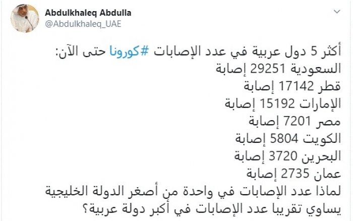 وأضاف: "لماذا عدد الإصابات في واحدة من أصغر الدولة الخليجية يساوي تقريبا عدد الإصابات في أكبر دولة عربية؟".