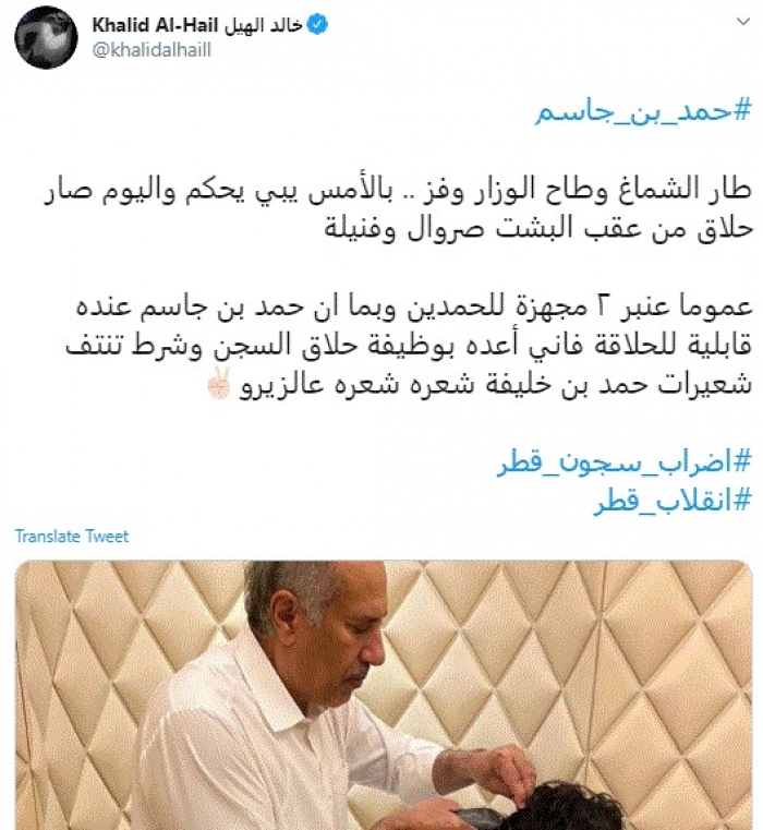 وقال في تغريدة عبر "تويتر" رصدها "المشهد العربي": "طار الشماغ وطاح الوزار وفز.. بالأمس يبي يحكم واليوم صار حلاق من عقب البشت صروال وفنيلة عموما عنبر ٢ مجهزة للحمدين وبما ان حمد بن جاسم عنده قابلية للحلاقة فاني أعده بوظيفة حلاق السجن وشرط تنتف شعيرات حمد بن خليفة شعره شعره عالزيرو".