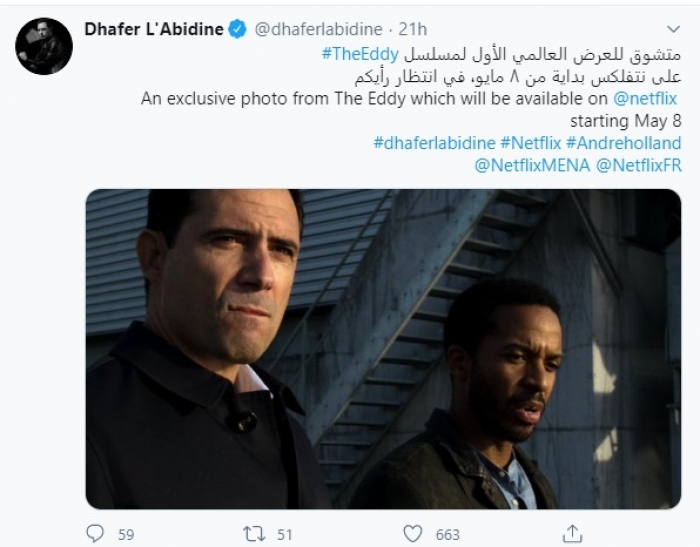 أعلن النجم التونسي ظافر العابدين موعد عرض المسلسل العالمي The Eddy، الذى يشارك ببطولته، وسيبدأ يوم 8 مايو الجارى على شبكة نتفليكس، وهو للمخرج الحائز على جائزة الأوسكار داميان شازيل .