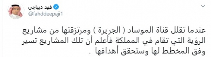وقال في تغريدة عبر "تويتر" رصدها "المشهد العربي": "عندما تقلل قناة الموساد (الجزيرة) ومرتزقتها من مشاريع الرؤية التي تقام في المملكة فأعلم أن تلك المشاريع تسير وفق المخطط لها وستحقق أهدافها".