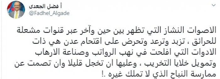 وقال في تغريدة عبر "تويتر" رصدها "المشهد العربي": "الأصوات النشاز التي تظهر بين حين وآخر عبر قنوات مشعلة للحرائق، تزبد وترعد وتحرض على اقتحام عدن هي ذات الأدوات التي أفلحت في نهب الرواتب وصناعة الإرهاب وتمويل خلايا التخريب".