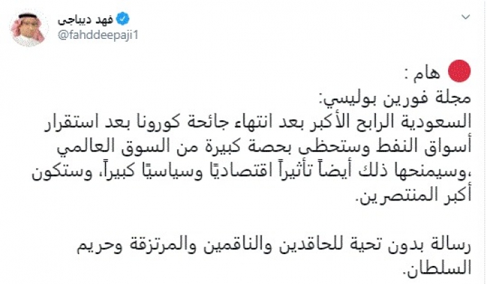 وقال في تغريدة عبر "تويتر" رصدها "المشهد العربي": "مجلة فورين بوليسي: السعودية الرابح الأكبر بعد انتهاء جائحة كورونا بعد استقرار أسواق النفط وستحظى بحصة كبيرة من السوق العالمي، وسيمنحها ذلك أيضاً تأثيراً اقتصاديًا وسياسيًا كبيراً، وستكون أكبر المنتصرين. رسالة بدون تحية للحاقدين والناقمين والمرتزقة وحريم السلطان".