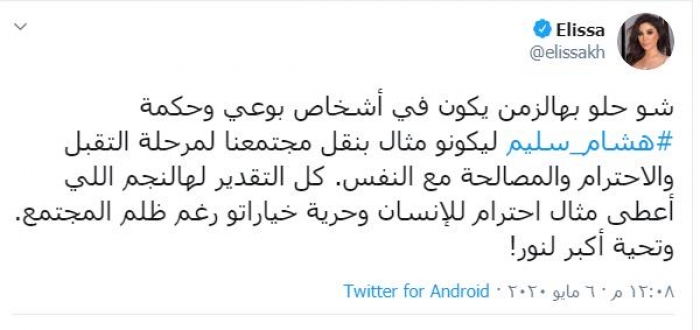 أشادت الفنانة اللبنانية إليسا، عبر حسابها الرسمي بموقع تويتر، بموقف الفنان الكبير هشام سليم، تجاه ابنه "نور" العابر جنسيا.