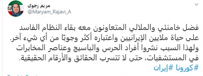 وكتبت في تغريدة عبر "تويتر" رصدها "المشهد العربي": "فضل خامنئي والملالي المتعاونون معه بقاء النظام الفاسد على حياة ملايين الإيرانيين واعتباره أكثر وجوبًا من أي شيء آخر".