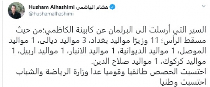 وقال في تغريدة عبر "تويتر" رصدها "المشهد العربي": "السير التي أرسلت الى البرلمان عن كابينة الكاظمي؛ من حيث مسقط الرأس؛ 11 وزيرًا مواليد بغداد، 3 مواليد ديالى، 1 مواليد الموصل، 1 مواليد الديوانية، 1 مواليد الانبار، 1 مواليد اربيل، 1 مواليد كركوك، 1 مواليد صلاح الدين".