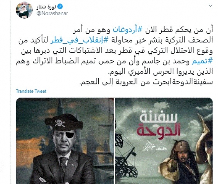 وقالت في تغريدة عبر "تويتر" رصدها "المشهد العربي": "من يحكم قطر الآن أردوغان وهو من أمر الصحف التركية بنشر خبر محاولة انقلاب في قطر لتأكيد من وقوع الاحتلال التركي في قطر بعد الاشتباكات التي دبرها بين تميم وحمد بن جاسم وأن من حمى تميم الضباط الاتراك وهم الذين يديروا الحرس الأميري اليوم. سفينة الدوحة أبحرت من العروبة إلى العجم".