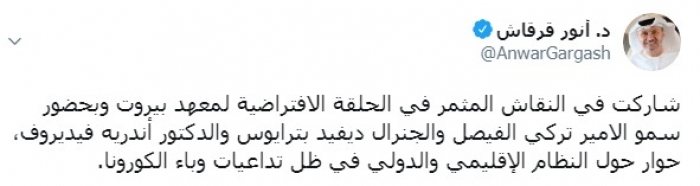 وكتب قرقاش عبر تغريدة له على "تويتر" رصدها " المشهد العربي": "شاركت في النقاش المثمر في الحلقة الافتراضية لمعهد بيروت وبحضور سمو الأمير تركي الفيصل والجنرال ديفيد بترايوس والدكتور أندريه فيديروف، حوار حول النظام الإقليمي والدولي في ظل تداعيات وباء الكورونا".