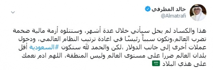 وكتب المطرفي عبر تغريدة له على "تويتر" رصدها " المشهد العربي":" هذا والكساد لم يحل سيأتي خلال عدة أشهر، وستتلوه أزمة مالية ضخمة تضرب العالم، وتكون سبباً رئيسًا في إعادة ترتيب النظام العالمي، ودخول عملات أخرى إلى جانب الدولار".