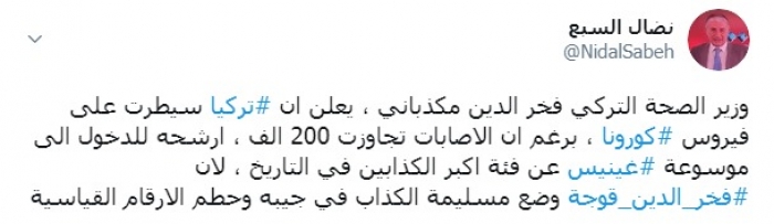 وكتب السبع عبر تغريدة له على "تويتر" رصدها " المشهد العربي":" وزير الصحة التركي فخر الدين مكذباني، يعلن أن تركيا سيطرت على فيروس كورونا، برغم إن الإصابات تجاوزت 200 ألف".