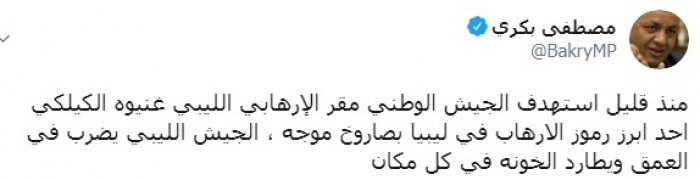 وكتب بكري عبر تغريدة له على "تويتر" رصدها " المشهد العربي":" منذ قليل استهدف الجيش الوطني مقر الإرهابي الليبي غنيوه الكيلكي أحد أبرز رموز الإرهاب في ليبيا بصاروخ موجه".