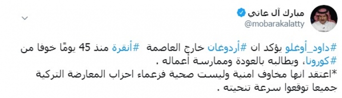 وكتب بن عاتي عبر تغريدة له على "تويتر" رصدها " المشهد العربي":"داود أوغلو يؤكد أن أردوغان خارج العاصمة أنقرة منذ 45 يومًا خوفا من كورونا، ويطالبه بالعودة وممارسة أعماله".