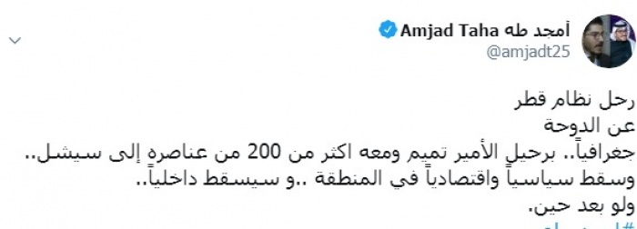 وكتب طه عبر تغريدة له على "تويتر" رصدها " المشهد العربي": "رحل نظام قطرعن الدوحة جغرافياً برحيل الأمير تميم ومعه أكثر من 200 من عناصره إلى سيشل".