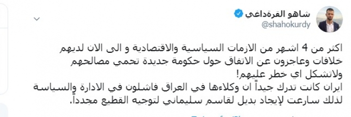 وأضاف:" إيران كانت تدرك جيداً أن وكلاءها في العراق فاشلون في الإدارة والسياسة لذلك سارعت لإيجاد بديل لقاسم سليماني لتوجيه القطيع مجدداً".