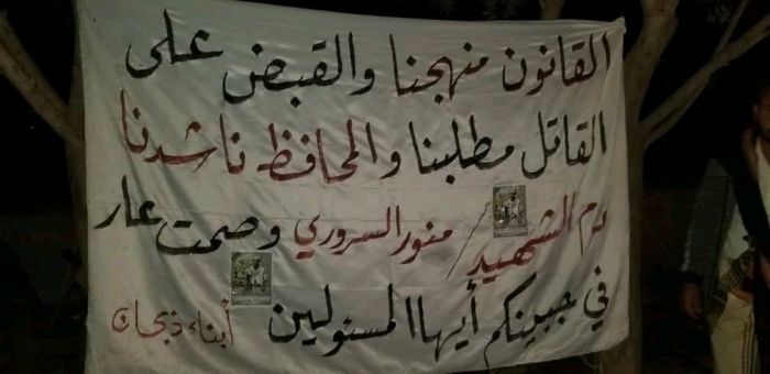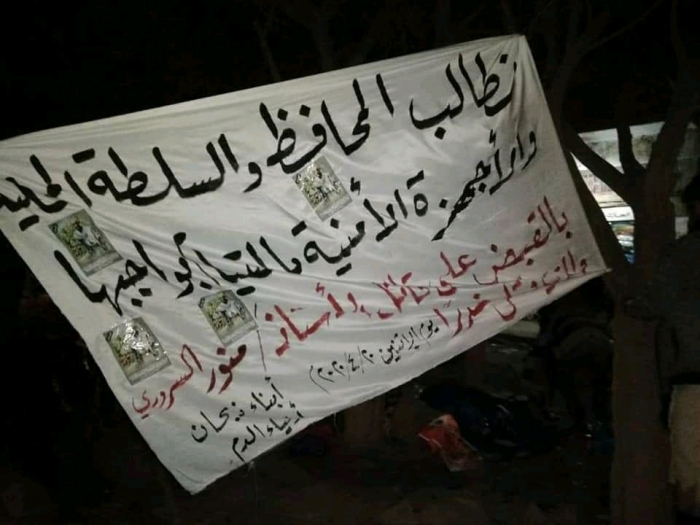 ورفع المسلحون لافتات تطالب بتسليم الجناة إلى العدالة لنيل الجزاء الرادع، متعهدين بالتصعيد حتى تسليم القتلة، الذين يحتمون بأحدى الأجهزة العسكرية الخاضعة لمليشيا الإخوان.