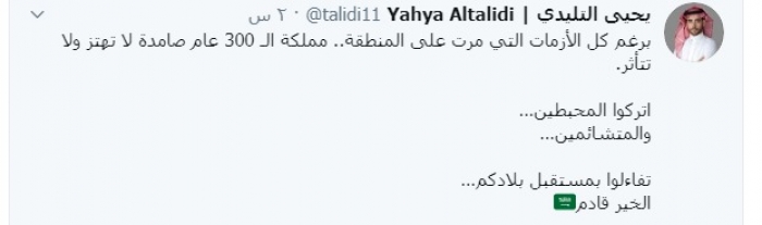 وكتب التليدي عبر تغريدة له على "تويتر" رصدها " المشهد العربي": "برغم كل الأزمات التي مرت على المنطقة، مملكة الـ 300 عام صامدة لا تهتز ولا تتأثر".