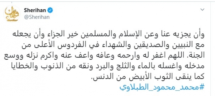 وكتبت شريهان، عبر حسابها على تويتر، قائلة: "إنا لله وإنا إليه راجعون في واحد من أهم القراء في تاريخ مصر شيخنا المصري الكريم محمد محمود الطبلاوى أحد أعلام شيوخنا المقرئين (القرآن الكريم) نسأل الله أن يتغمد شيخنا الجليل العظيم، وأن يلهم أهله وطلابه وأصحابه ومحبيه الصبر والسلوان".