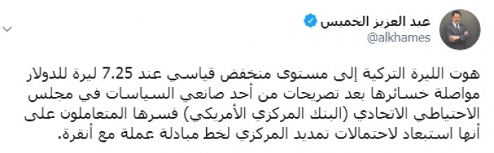 وكتب الخميس عبر تغريدة له على "تويتر" رصدها " المشهد العربي": "هوت الليرة التركية إلى مستوى منخفض قياسي عند 7.25 ليرة للدولار مواصلة خسائرها بعد تصريحات من أحد صانعي السياسات في مجلس الاحتياطي الاتحادي (البنك المركزي الأمريكي) فسرها المتعاملون على أنها استبعاد لاحتمالات تمديد المركزي لخط مبادلة عملة مع أنقرة".