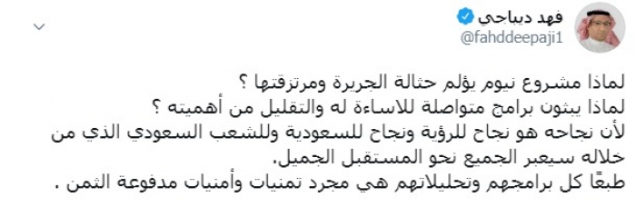 وتساءل ديباجي عبر تغريدة له على "تويتر" رصدها " المشهد العربي": "لماذا مشروع نيوم يؤلم...الجريرة ومرتزقتها ؟ لماذا يبثون برامج متواصلة للإساءة له والتقليل من أهميته ؟".