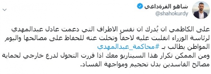 وكتب عبر تغريدة له على "تويتر" رصدها " المشهد العربي": "على الكاظمي أن يُدرك أن نفس الأطراف التي دعمت عادل عبد المهدي لرئاسة الوزراء انقلبت عليه لاحقاً وتخلت عنه للحفاظ على مصالحها،واليوم المواطن يطالب بـمحاكمة عبد المهدي".
