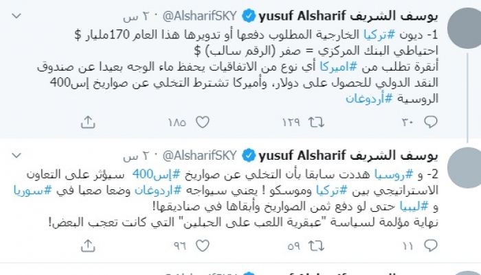 وكتب الشريف عبر تغريدة له على "تويتر" رصدها " المشهد العربي":"ديون تركيا الخارجية المطلوب دفعها أو تدويرها هذا العام 170مليار $، واحتياطي البنك المركزي = صفر (الرقم سالب) $ ".
